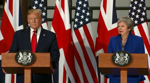 特朗普今天前往唐寧街首相府,與即將辭去首相一職的文翠珊會面,兩人會談後見記者。文翠珊表示她與特朗普討論了多項議題,包括氣候變化、安全事務、伊朗核問題及對華政策等,文翠珊承認兩人在部分問題有分歧。特朗普則表示,美英之間的同盟關係,是世界有史以來最強大的盟友關係。他同時重申,華府將致力與英國,達成前所未有的貿易協議,令美英之間的貿易增長兩倍,甚至三倍。