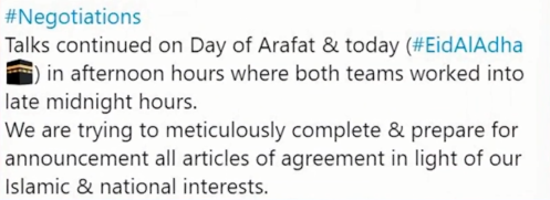 穆賈希德表示會議持續到深夜,他發文指工作長但有效,雙方同意就下一步行動徵求各自領袖的意見。美國阿富汗問題特使,哈利勒紮德亦表示,將前往華府進行諮詢。目前,美國及塔利班都無進一步公開會議的詳情。