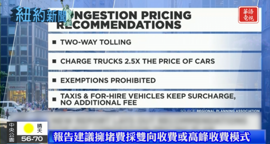 根據區域計劃協會的收費計劃,司機們需要在早上5點到晚上11點之間花6.12美元才可以進入曼哈頓最繁忙的區域。該區域將包括60街以南的所有街道。區域計劃協會表示,這一種收費模式是雙向收費,意味著司機進入該區域和離開時都要收費。此舉是為了阻止試圖通過尋找最便宜的出路來避開擁堵地帶的司機。另一種收費即是高峰時段收費定價,意思是將在早晚高峰時段向司機收取高達9.18美元的費用。