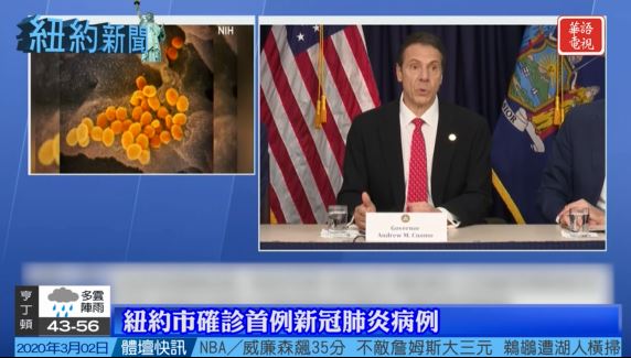 紐約州州長庫默週日晚宣佈,紐約州出現首例新冠肺炎確診病例。該名病例為一名30歲左右的女性,近期曾前往伊朗,目前被隔離於其位於紐約曼哈頓的家中。