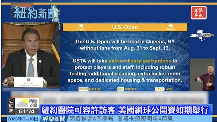 紐約州長庫默(Andrew Cuomo)週二表示,紐約州內的醫院將容許訪客探訪。他亦宣佈,今年的美國網球公開賽將如期於皇后區舉行,但不會對外開放。
