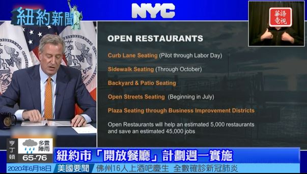 紐約市市長白思豪早前宣佈的「開放餐廳」計劃,將在下週一(22日)開始實施。餐廳座位將擴大到人行道、街道、廣場和開放街道的路邊,並將至少持續到勞動節。