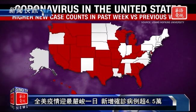 根據最新統計數據顯示,美國週三單日新增新冠確診病例達到創紀錄的45,557例,是疫情爆發以來的最高單日記錄。