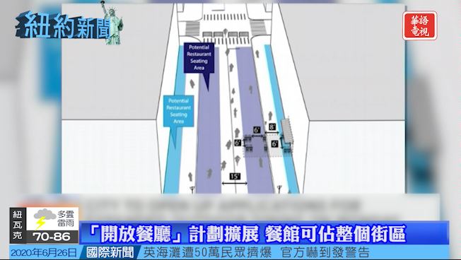 紐約市官員週五宣布,擴展「開放餐廳」的計劃,讓餐館能佔領整個街區以提供戶外用餐。
