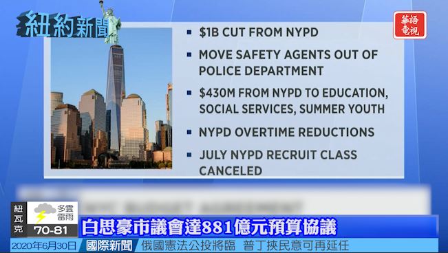 紐約市市長白思豪(Bill de Blasio)週二宣布與市議會達成一項協議,批准一項881億元的預算,當中包括削減紐約市警10億元的資金。