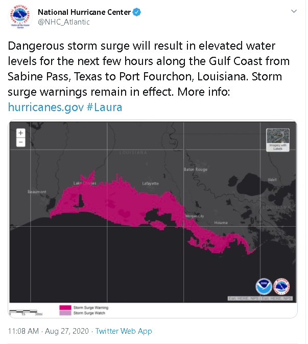 四級颶風「蘿拉」(Laura)於週三(26日)午夜時分在路易斯安那州卡梅倫縣(Cameron)登陸,帶來狂風暴雨及洶湧大浪,預料將在路易斯安那州西南部及德州東南部引起洪災。