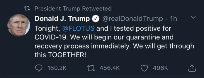 特朗普寫到,「今晚,我和@FLOTUS 確診了新冠病毒。我們將立即開始隔離和恢復過程。我們將共同克服!」