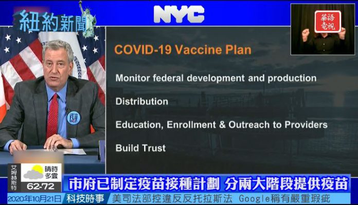 州府日前公布的疫苗接種草案,紐約市市長白思豪(Bill de Blasio)今日表示,市府已經制定疫苗接種計劃,實施計劃將取決於疫苗獲批的時間,但傾向於儘快展開。
